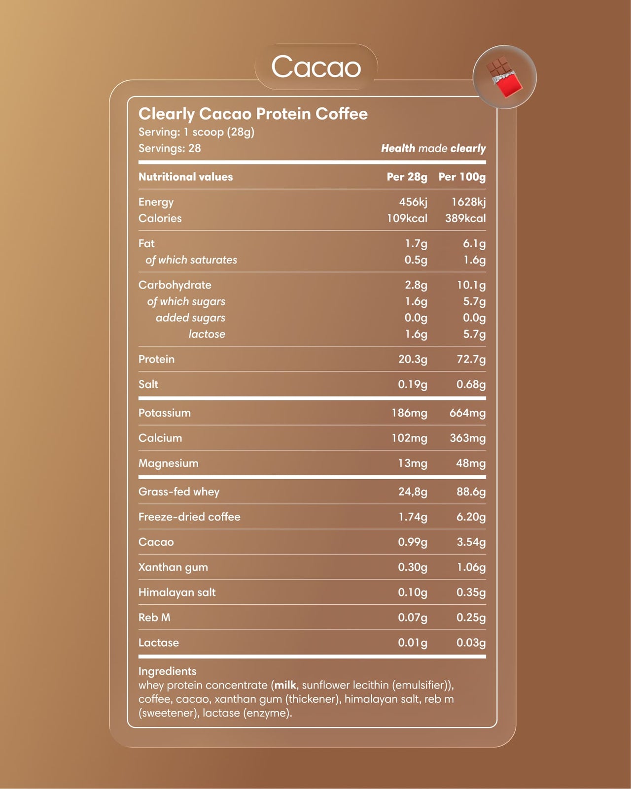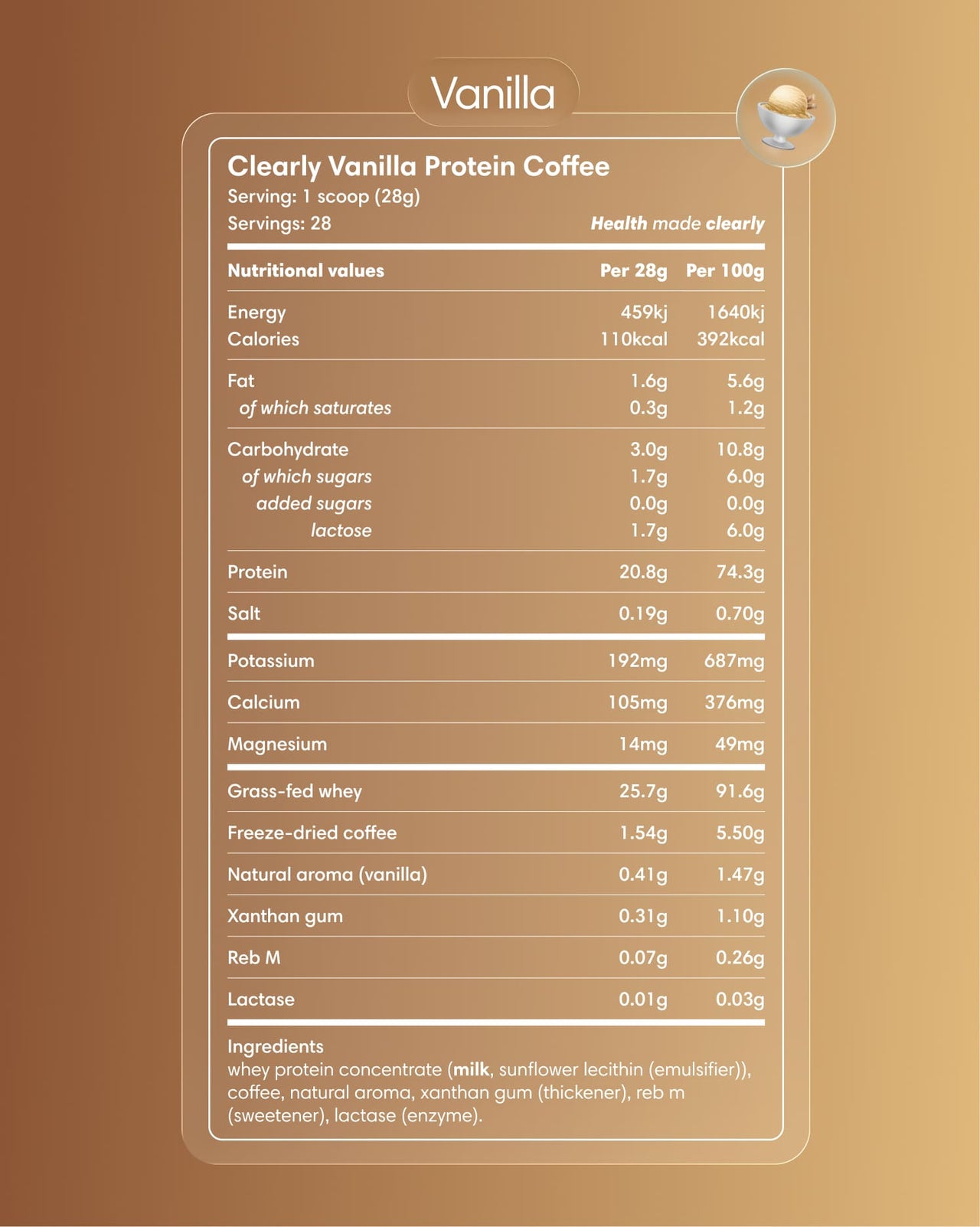 Our Protein Iced Coffee combines 100% Colombian arabica coffee with grass-fed whey from New Zealand. The coffee is freeze-dried to optimally preserve its flavor, and the whey comes from cows that graze outdoors at least 350 days per year. A clean alternative with 21 g of protein and 35–45 mg of caffeine.